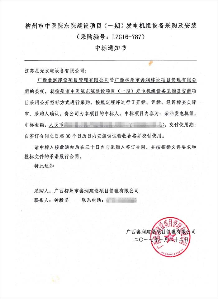 2017年2月21日,我公司傳來中標喜訊,收到柳州市中醫(yī)院東院的中標通知書。中標機組品牌為:里卡多柴油發(fā)動機配星光發(fā)電機,功率為800KW.我公司將于30天內(nèi)與該用戶簽訂合同,并按照招標文件要求和投標文件的承諾履行合同。交付使用期為自簽訂合同之日起30個日內(nèi)安裝調(diào)試驗收合格并交付使用。