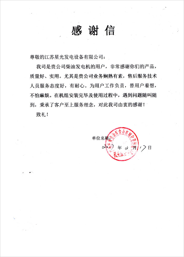2月17日,我公司很榮幸收到廣西壯族自治區(qū)農(nóng)業(yè)機(jī)械化管理局機(jī)關(guān)服務(wù)中心的感謝信。信中提到我們公司的售后服務(wù)技術(shù)人員服務(wù)態(tài)度好,有耐心。對(duì)用戶工作負(fù)責(zé),替用戶著想,在發(fā)電機(jī)組安裝完畢及使用過(guò)程中,遇到問(wèn)題能夠及時(shí)解決。該單位對(duì)我公司的售后服務(wù)給予了充分肯定。我公司將繼續(xù)秉承“客戶至上”的服務(wù)理念,“以誠(chéng)待人,以心換心”,為用戶提供更優(yōu)質(zhì)的產(chǎn)品及服務(wù)。