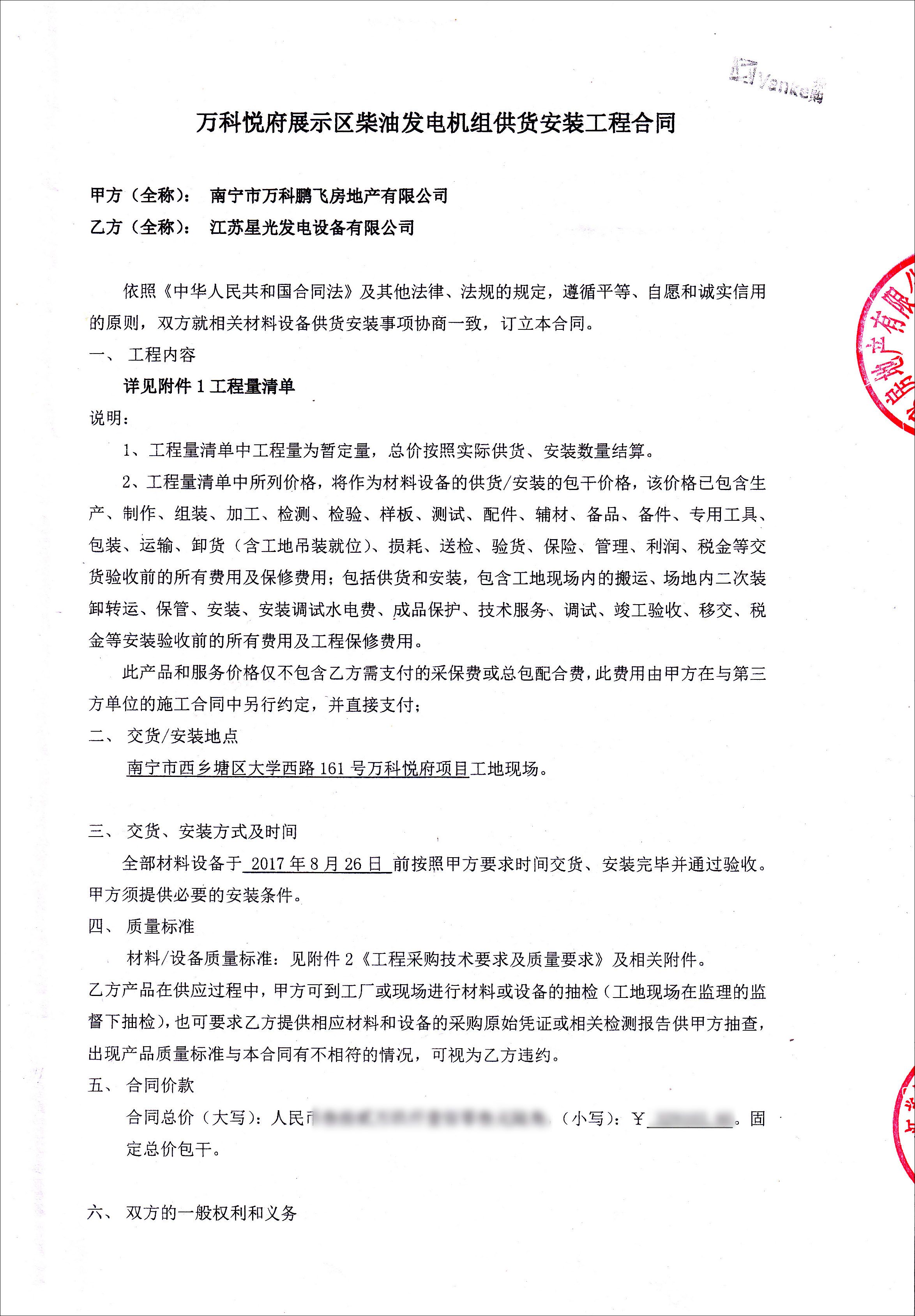 8月,我公司與南寧萬(wàn)科鵬飛公司簽訂合同,確定我公司為萬(wàn)科悅府展示區(qū)柴油發(fā)電機(jī)組供貨安裝單位。我公司將嚴(yán)格按照合同要求保質(zhì)保量按時(shí)供貨安裝、調(diào)試并通過(guò)驗(yàn)收等。