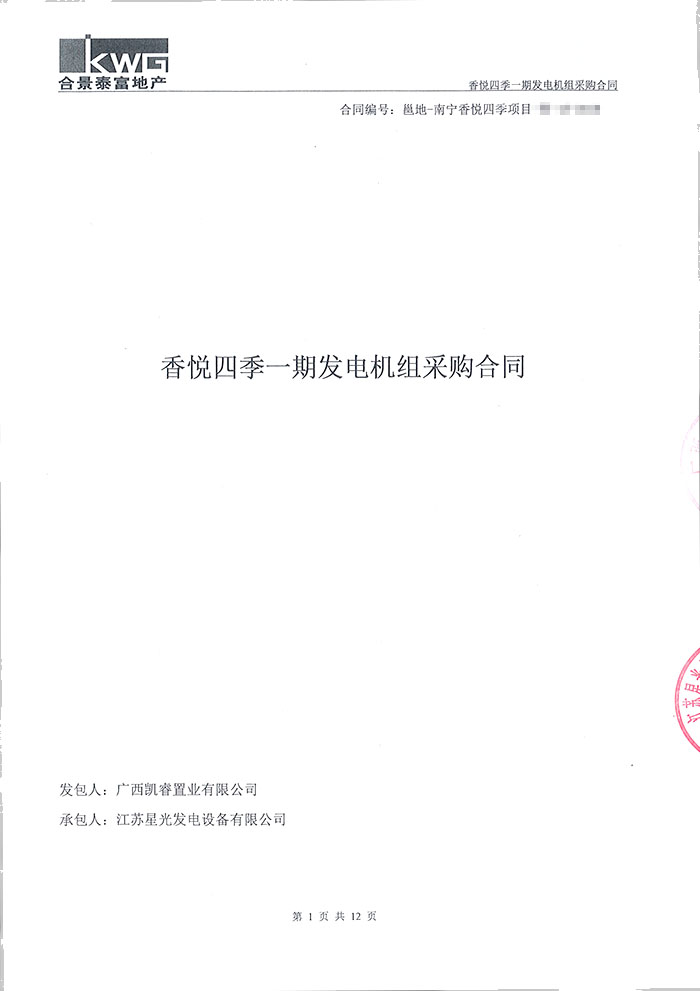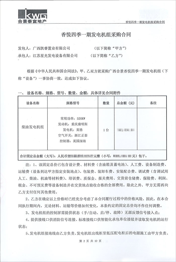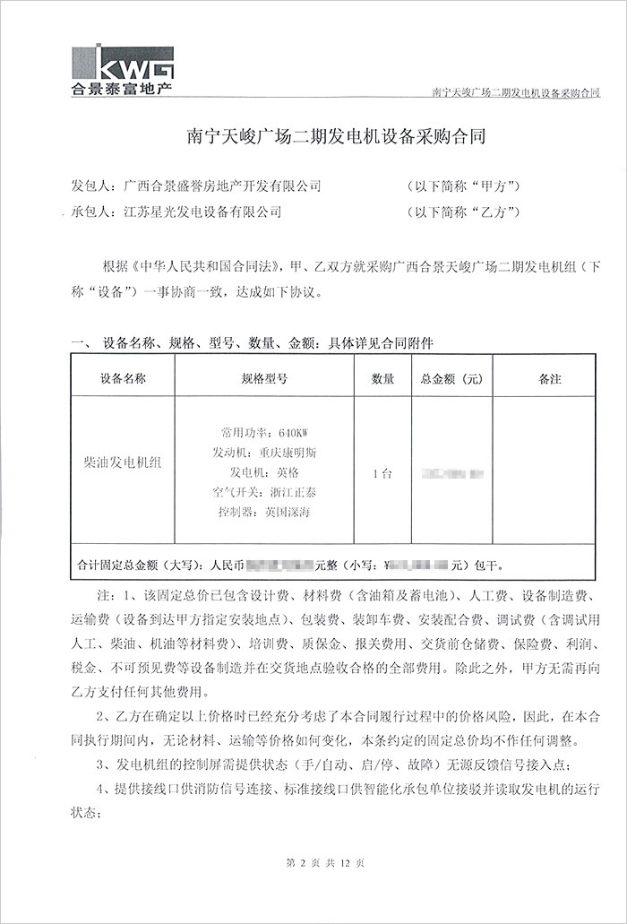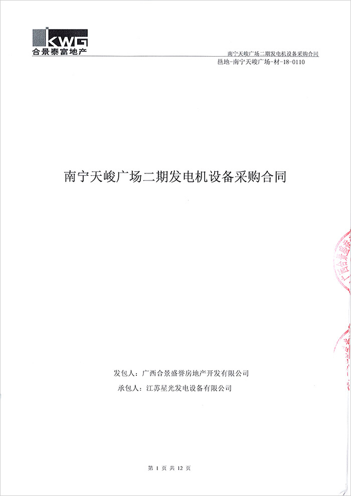 近期,我公司和合景泰富旗下子公司廣西合景盛譽房地產(chǎn)開發(fā)有限公司以及廣西凱睿置業(yè)有限公司分別簽訂一臺640KW重慶康明斯發(fā)電機組、一臺520KW重慶康明斯發(fā)電機組分別用于南寧香悅四季一期、南寧天峻廣場二期應急備用電源。