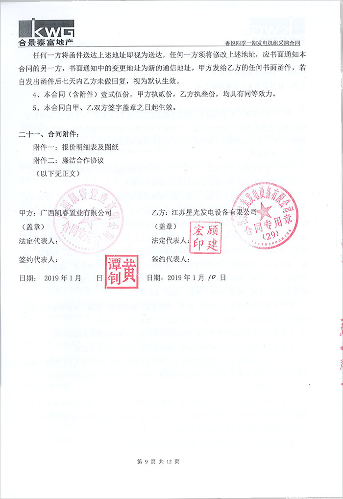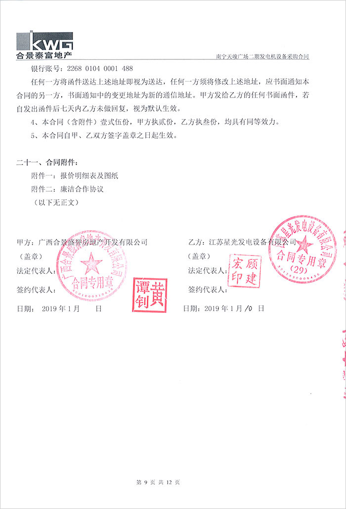 合景泰富地產(chǎn)控股有限公司為大型房地產(chǎn)開發(fā)商,創(chuàng)立于1995年,現(xiàn)已發(fā)展成為一個以房地產(chǎn)開發(fā)為主,集資產(chǎn)經(jīng)營和物業(yè)管理為一體的多元化企業(yè),其房地產(chǎn)開發(fā)項目涵蓋頂級豪宅、大型國際別墅社區(qū)、優(yōu)質住宅屋苑、超甲級寫字樓、國際品牌星級酒店和大型購物中心。感謝合景泰富地產(chǎn)本次柴油發(fā)電機組采購項目選擇星光公司作為供應商,感謝合景泰富地產(chǎn)及其子公司對星光公司的支持!
