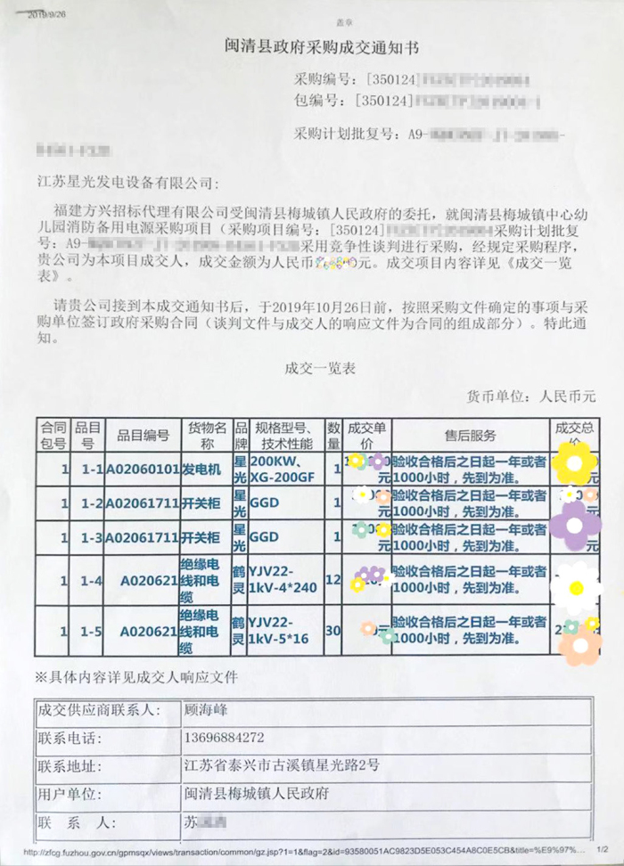 近日,我公司收到福建方興招標(biāo)代理有限公司為我們發(fā)來的關(guān)于閩清縣政府采購成交通知書,文中提到其受閩清縣梅城鎮(zhèn)人民政府的委托,就閩清縣梅城鎮(zhèn)中心幼兒園消防備用電源采購項(xiàng)目采用競(jìng)爭(zhēng)性談判進(jìn)行采購,經(jīng)規(guī)定采購程序,確定我公司為該幼兒園200KW柴油發(fā)電機(jī)組采購項(xiàng)目的成交人,并要求我公司接到本成交通知書后,于2019年10月26日按照采購文件確定的事項(xiàng)與采購單位簽訂政府采購合同。