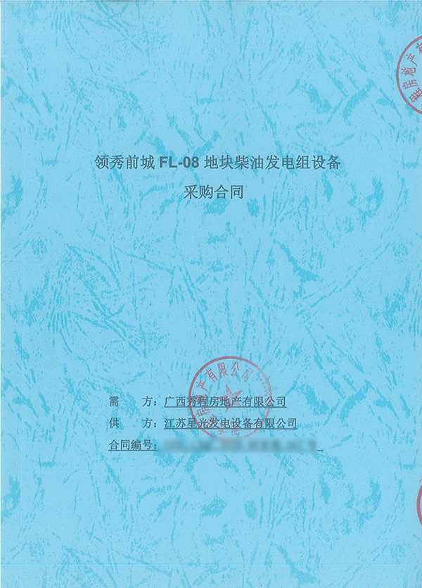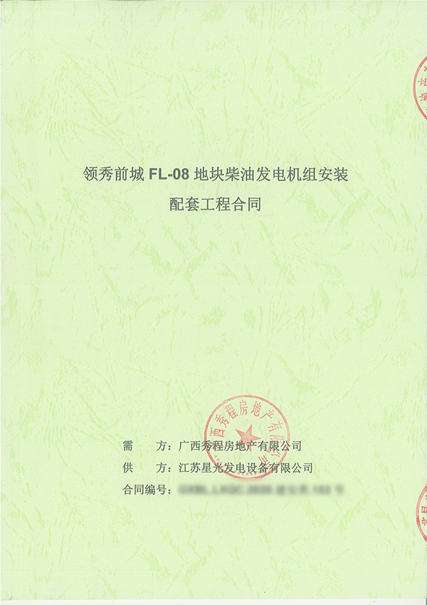 2021117日,江蘇星光公司與廣西秀程房地產(chǎn)有限公司成功簽訂一臺800KW柴油發(fā)電機組及配套安裝工程,機組配置為無動柴油機配英格發(fā)電機,具有油耗低、噪聲小、排放低、易啟動、可靠性強、性能穩(wěn)定、操作簡單、保養(yǎng)方便等優(yōu)勢特點,該機組將用于領(lǐng)秀前城FL-08地塊。