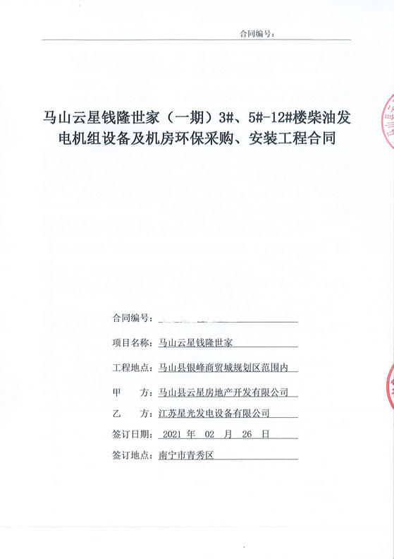 江蘇星光動力集團(tuán) >> 新聞動態(tài) >> 恭喜我司與馬山云星錢隆世家再次簽訂一臺500KW柴油發(fā)電機(jī)組