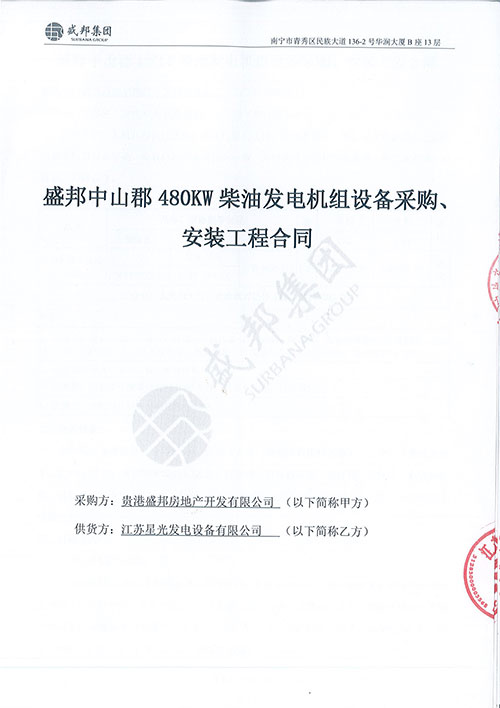 江蘇星光動(dòng)力集團(tuán) >> 新聞動(dòng)態(tài) >> 祝賀我司與貴港盛邦中心郡簽訂480KW上柴柴油發(fā)電機(jī)組及機(jī)房排煙降噪環(huán)保工程