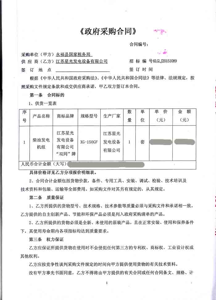 2015年12月28日,廣西永??h國家稅務局與我公司簽訂了150KW發(fā)電機組購銷合同,我公司為其提供里卡多柴油發(fā)電機配星光發(fā)電機的柴油發(fā)電機組一臺。江蘇星光動力集團自成立以來就以技術創(chuàng)新為己任,設計生產的柴油發(fā)電機組一直在同行業(yè)中遙遙領先,得到各種外界人士的認可。發(fā)電機產品購銷合同如下: