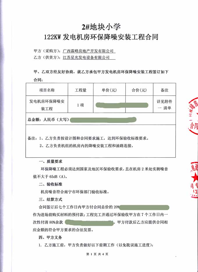 2016年6月21日 我公司與廣西霖峰房地產(chǎn)開發(fā)有限公司成功簽訂2#塊地小學(xué)122KW發(fā)電機(jī)房環(huán)保降噪安裝工程合同,我公司為其提供一臺里卡多柴油發(fā)電機(jī)(機(jī)組配置為江蘇里卡多發(fā)動機(jī)配星光發(fā)電機(jī))的機(jī)房環(huán)保降噪除塵安裝工程的工作,我公司負(fù)責(zé)工程所需材料購買、安裝和油路連接,并保證工程達(dá)到環(huán)保驗(yàn)收標(biāo)準(zhǔn)要求。合同如下: