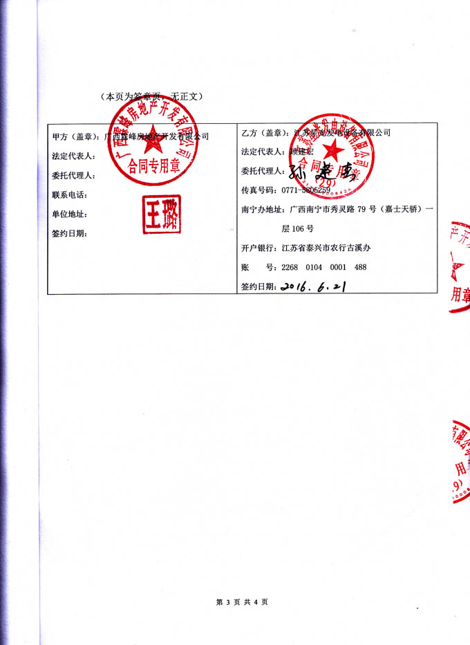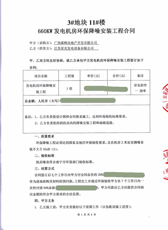 2016年6月21日 廣西霖峰房地產(chǎn)開發(fā)有限公司與我公司簽訂3#塊地11#樓660KW發(fā)電機房環(huán)保降噪安裝工程合同,我公司為其提供一臺機組配置為里卡多發(fā)動機配星光發(fā)電機的660KW發(fā)電機組機房環(huán)保降噪除塵安裝工程的工作,負載工程所需材料購買、安裝和油路連接,并保證工程達到環(huán)保驗收標準要求。合同如下: