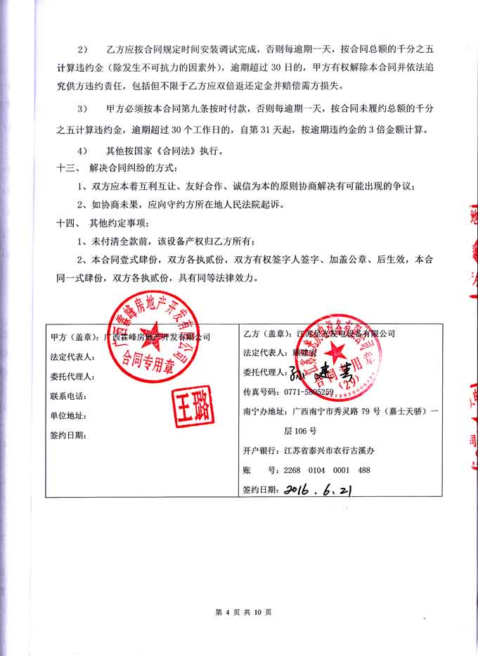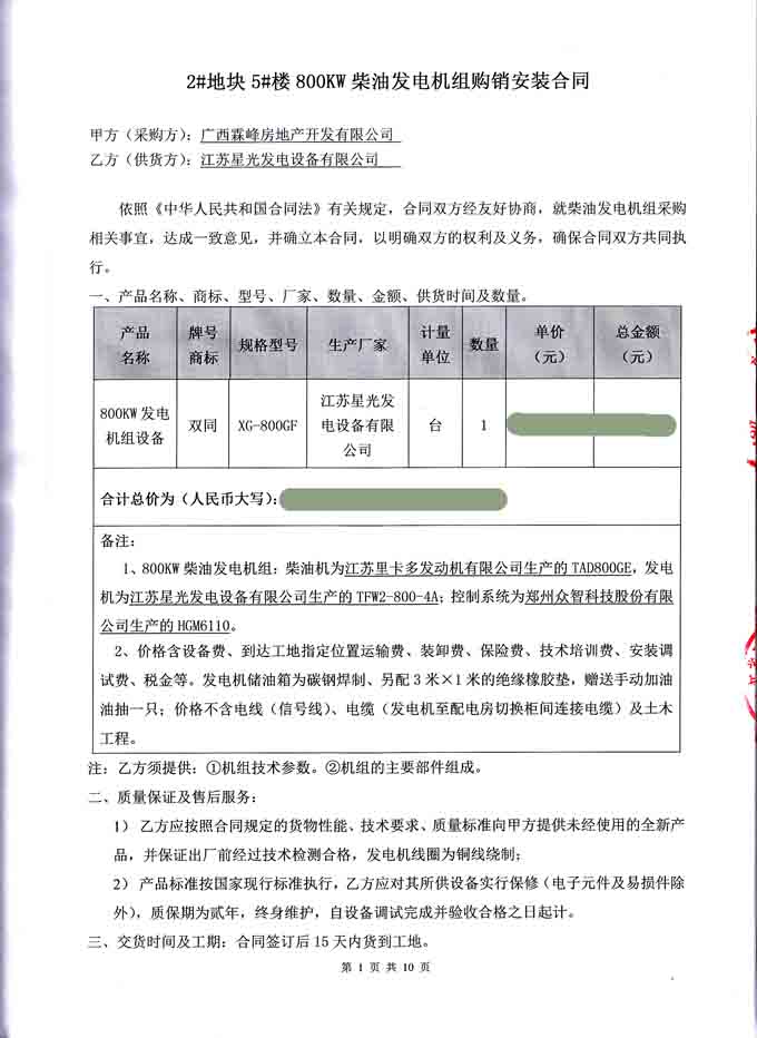 2016年6月21日,我江蘇星光動(dòng)力集團(tuán)成功與廣西霖峰房地產(chǎn)開發(fā)有限公司簽訂2#塊地5#樓800KW柴油發(fā)電機(jī)組購銷安裝合同,我公司為其提供一臺(tái)配置為為江蘇里卡多發(fā)動(dòng)機(jī)配星光發(fā)電機(jī)和眾智控制器的發(fā)電機(jī)組,并負(fù)責(zé)機(jī)組的運(yùn)輸安裝和調(diào)試工作及對發(fā)電機(jī)操作人員進(jìn)行培訓(xùn)。發(fā)電機(jī)產(chǎn)品購銷合同如下:
