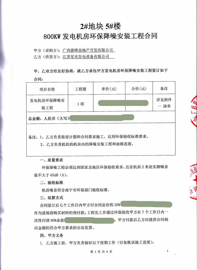 2016年6月21日 我江蘇星光發(fā)電設(shè)備有限公司成功與廣西霖峰房地產(chǎn)開發(fā)有限公司簽訂2#塊地5#樓800KW發(fā)電機(jī)房環(huán)保降噪安裝工程合同,我公司為其提供機(jī)組的機(jī)房環(huán)保降噪除塵安裝工程額油路的連接工作,負(fù)責(zé)按設(shè)計(jì)圖和施工要求采購工程所需材料進(jìn)行施工,并保證工程達(dá)到環(huán)保驗(yàn)收標(biāo)準(zhǔn)要求。合同如下: