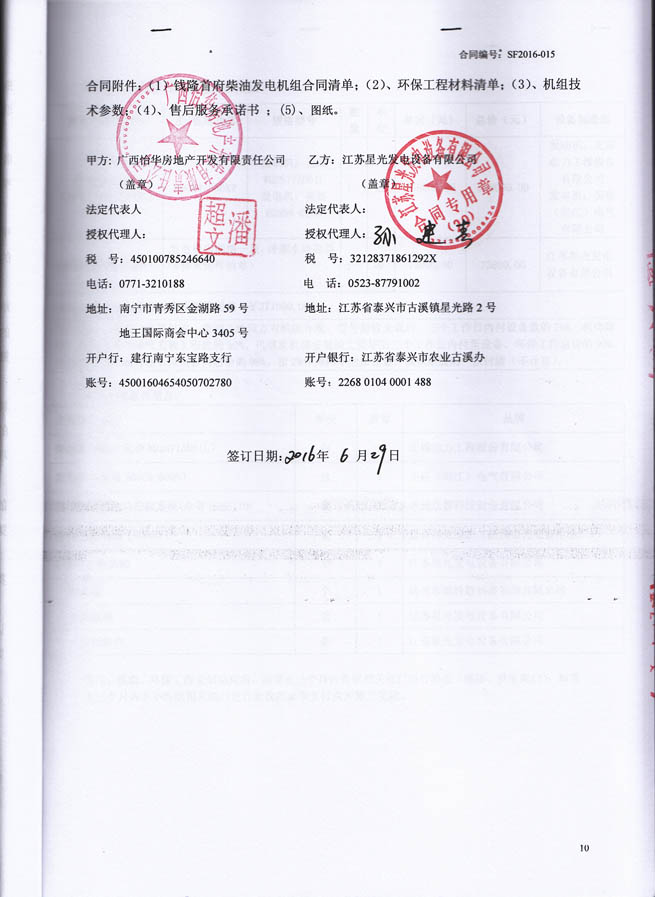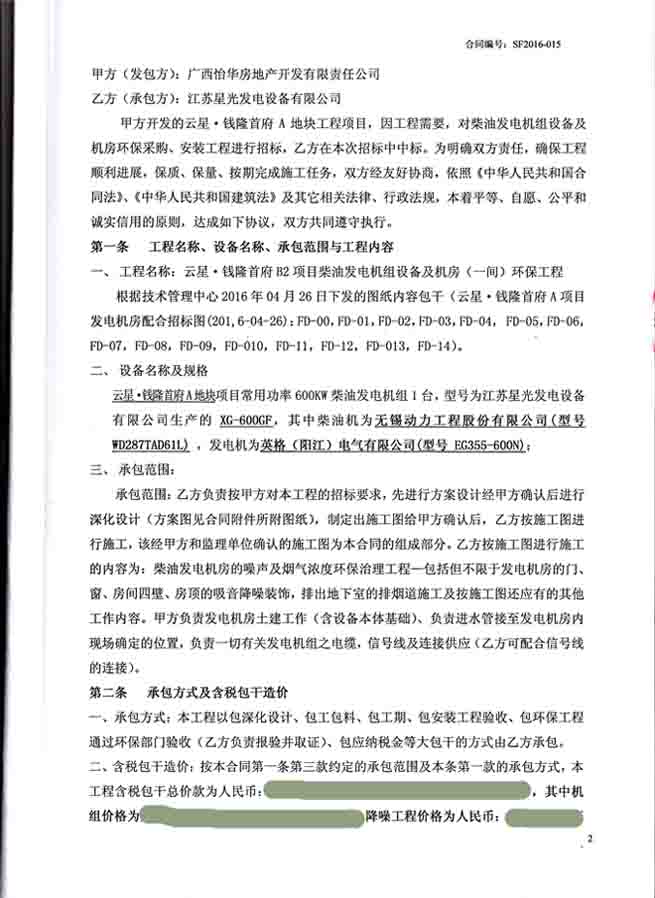 2016年6月29日,廣西怡華房地產(chǎn)開發(fā)有限責任公與我公司簽訂云星?錢隆首府A塊地(1號樓、2號樓、5號樓、6號樓)柴油發(fā)電機設備及機房環(huán)保采購、安裝工程合同,我公司為其提供常用功率600KW柴油發(fā)電機組1臺,型號為我江蘇星光發(fā)電設備有限公司生產(chǎn)的XG-600GF,其中柴油機為無錫動力工程股份有限公司(型號WD287TAD61L),發(fā)電機為英格(陽江)電氣有限公司(型號EG355-600N)。