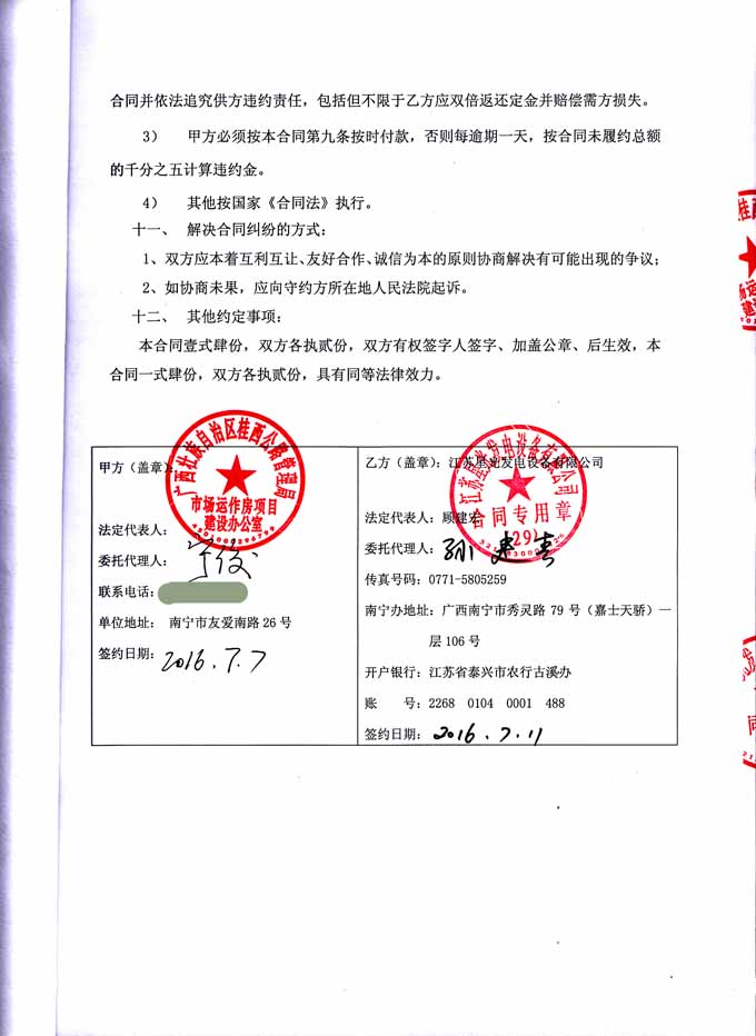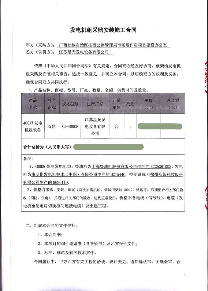 2016年6月29日,廣西壯族自治區(qū)桂西公路管理局市場運(yùn)作房項(xiàng)目建設(shè)辦公室與我公司簽訂發(fā)電機(jī)組采購安裝施工合同,我公司負(fù)責(zé)提供雙同牌400KW發(fā)電機(jī)組設(shè)備一臺及機(jī)組的安裝調(diào)試、試運(yùn)行、后期配合相關(guān)部門驗(yàn)收(消防、供電),并通過相關(guān)部門的驗(yàn)收,達(dá)到正常使用等工作。發(fā)電機(jī)產(chǎn)品購銷合同如下: