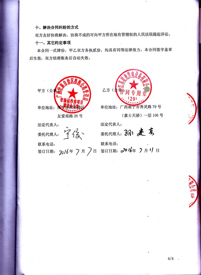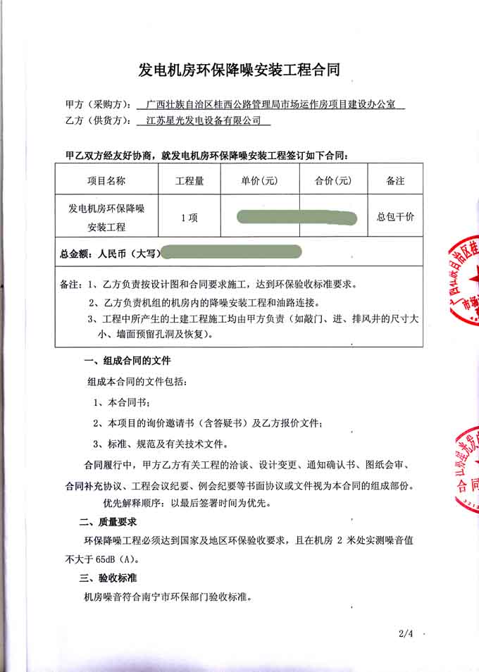 2016年6月29日,我公司與廣西壯族自治區(qū)桂西公路管理局市場運作房項目建設辦公室成功簽訂發(fā)電機房環(huán)保降噪安裝工程合同,我公司負責為其提供一臺400KW柴油發(fā)電機組機房內(nèi)的降噪安裝工程和油路連接,按照設計圖和合同要求施工,達到環(huán)保驗收標準要求等工作。合同如下: