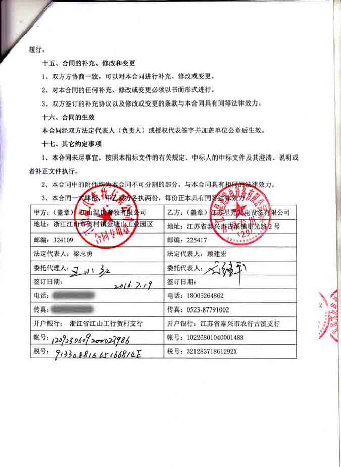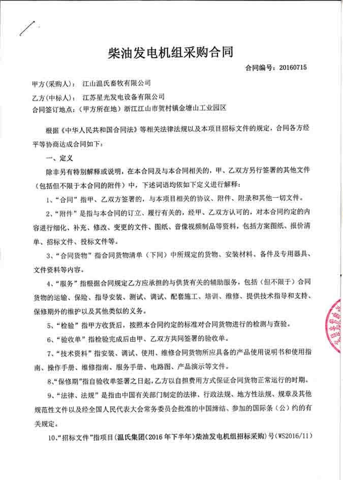 江蘇星光動(dòng)力集團(tuán) >> 新聞動(dòng)態(tài) >> 江山溫氏畜牧有限公司160KW康明斯發(fā)電機(jī)組采購(gòu)合同