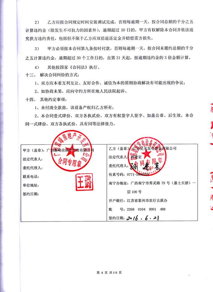 2016年6月21日,廣西霖峰房地產(chǎn)開(kāi)發(fā)有限公司與我公司簽訂3#塊地 9#樓柴油發(fā)電機(jī)組購(gòu)銷(xiāo)安裝合同,我公司為其提供一臺(tái)800KW發(fā)電機(jī)組,機(jī)組配置為江蘇里卡多發(fā)動(dòng)機(jī)配星光發(fā)電機(jī)。發(fā)電機(jī)產(chǎn)品購(gòu)銷(xiāo)合同如下: