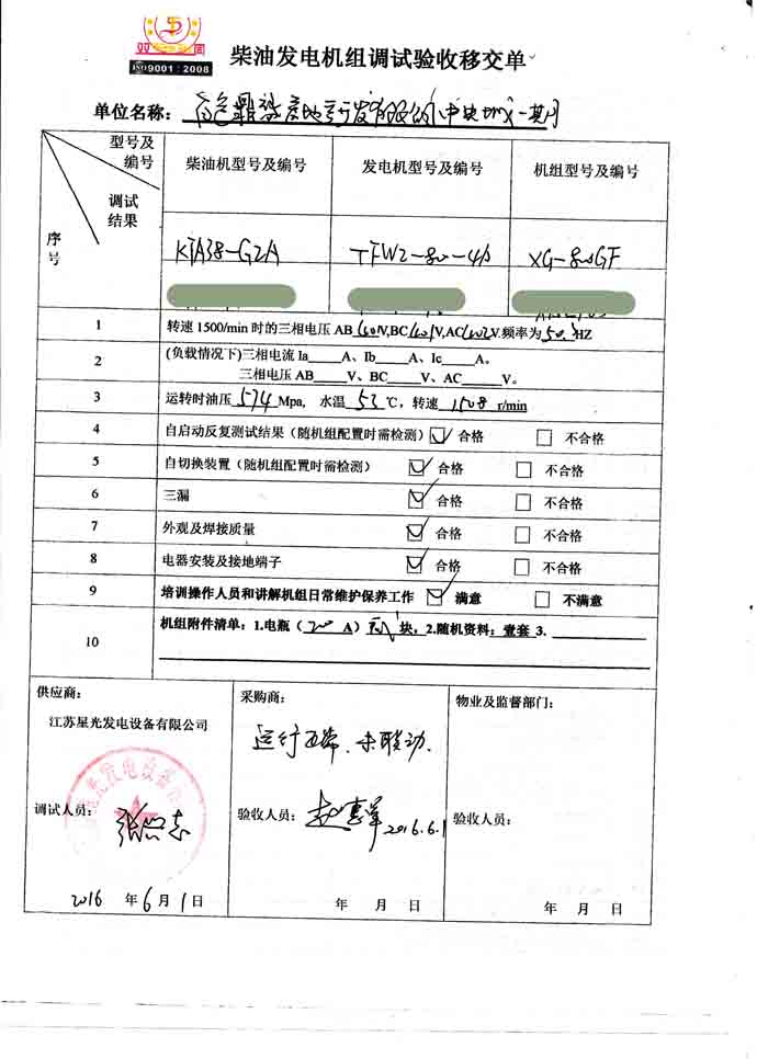 2016年6月1日,我公司技術(shù)服務(wù)人員到中央城一期的發(fā)電機(jī)安裝現(xiàn)場(chǎng),對(duì)百色鼎盛房地產(chǎn)開發(fā)有限公司向我公司購(gòu)買的800KW康明斯柴油發(fā)電機(jī)組進(jìn)行調(diào)試交付工作,并培訓(xùn)操作人員和講解機(jī)組日常維護(hù)保養(yǎng)工作。以下是發(fā)電機(jī)組調(diào)試驗(yàn)收單: