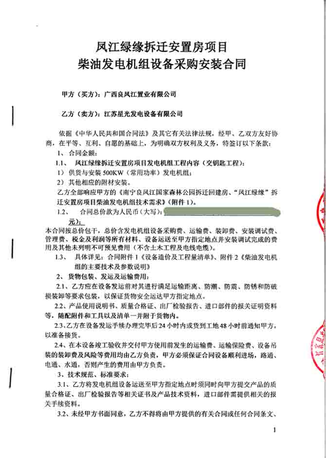 2015年10月31日,我公司與廣西良鳳江職業(yè)有限公司簽訂鳳江綠緣拆遷安置房項目柴油發(fā)電機組設(shè)備采購安裝合同,我公司為其提供一臺500KW發(fā)電機組(機組配置為上柴柴油機配上海馬拉松發(fā)電機)的供貨運輸安裝調(diào)試及操作人員的培訓(xùn)。發(fā)電機產(chǎn)品購銷合同如下: