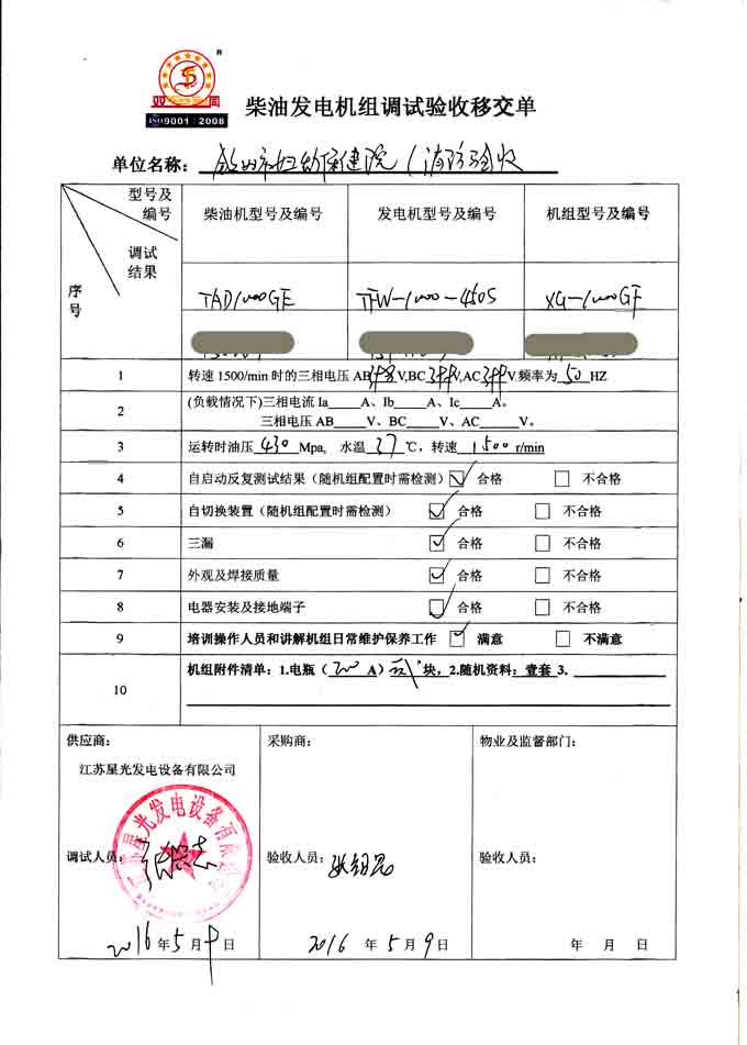 2016年5月9日,我江蘇星光動(dòng)力集團(tuán)技術(shù)人員到欽州市婦幼保健院的發(fā)電機(jī)組安裝現(xiàn)場(chǎng),對(duì)我公司提供的兩臺(tái)1000KW柴油發(fā)電機(jī)組進(jìn)行調(diào)試交付工作,并為用戶培訓(xùn)操作人員和講解機(jī)組日常維護(hù)保養(yǎng)工作。以下是發(fā)電機(jī)組調(diào)試驗(yàn)收單: