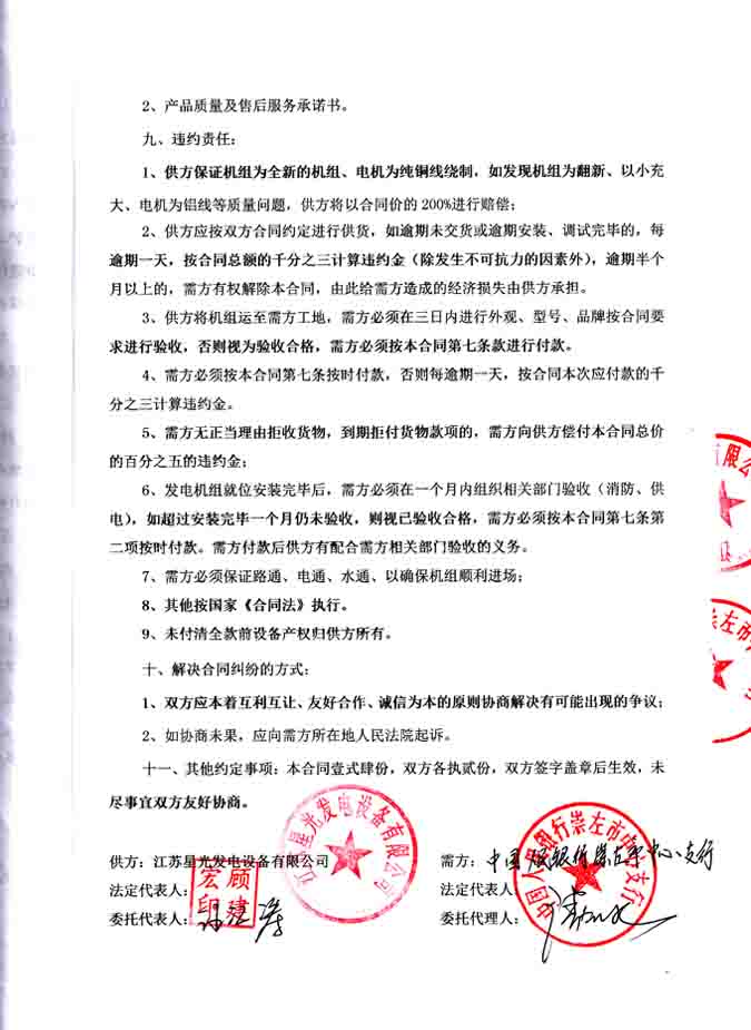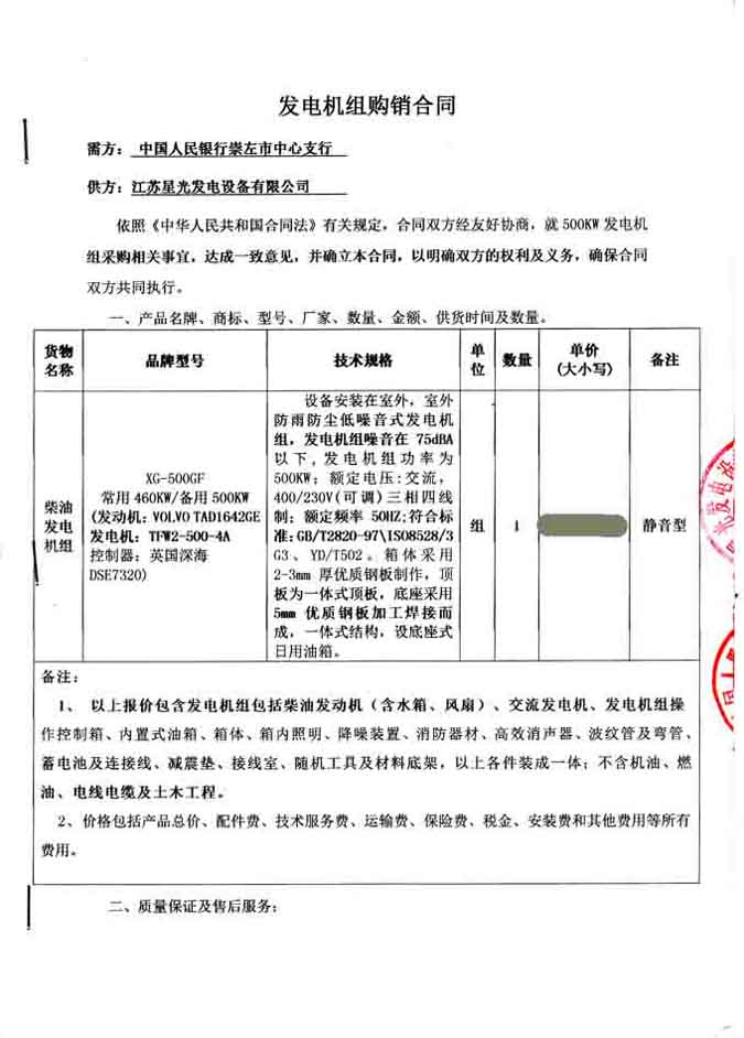 江蘇星光動(dòng)力集團(tuán) >> 新聞動(dòng)態(tài) >> 中國(guó)人民銀行崇左市中心支行500KW沃爾沃發(fā)電機(jī)組購(gòu)銷合同