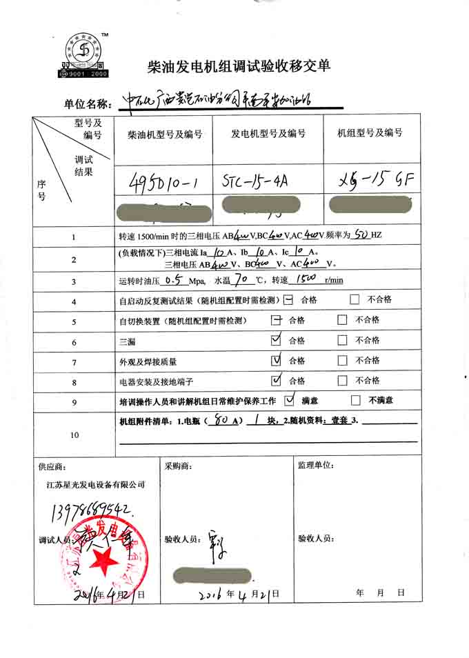 2016年4月21日,在中石化廣西貴港石油分公司平南平安加油站的發(fā)電機(jī)組安裝現(xiàn)場(chǎng),就平南加油站與我公司夠買的15KW濰柴發(fā)電機(jī)進(jìn)行調(diào)試驗(yàn)收移交工作,此刻機(jī)制已經(jīng)做好安裝調(diào)試工作,操作人員的培訓(xùn)和講解機(jī)組日常維護(hù)保養(yǎng)注意事項(xiàng),以下是發(fā)電機(jī)組調(diào)試驗(yàn)收單: