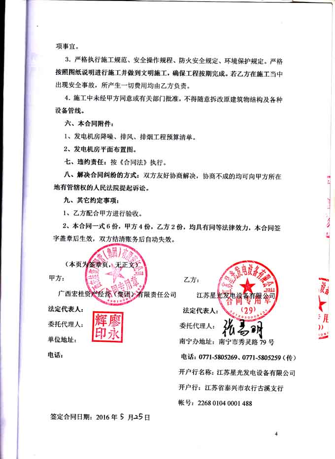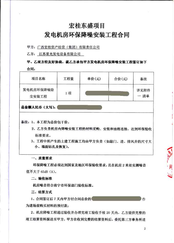 2016年5月25日 廣西宏桂資產(chǎn)經(jīng)營(yíng)(集團(tuán))有限責(zé)任公司工程與我公司簽訂宏桂東盛項(xiàng)目發(fā)電機(jī)房環(huán)保降噪安裝工程合同,我公司為其提供一臺(tái)640KW里卡多柴油發(fā)電機(jī)的發(fā)電機(jī)房環(huán)保降噪除塵安裝工程的工作,負(fù)載工程所需材料購(gòu)買、安裝和油路連接,并保證工程達(dá)到環(huán)保驗(yàn)收標(biāo)準(zhǔn)要求。合同如下:
