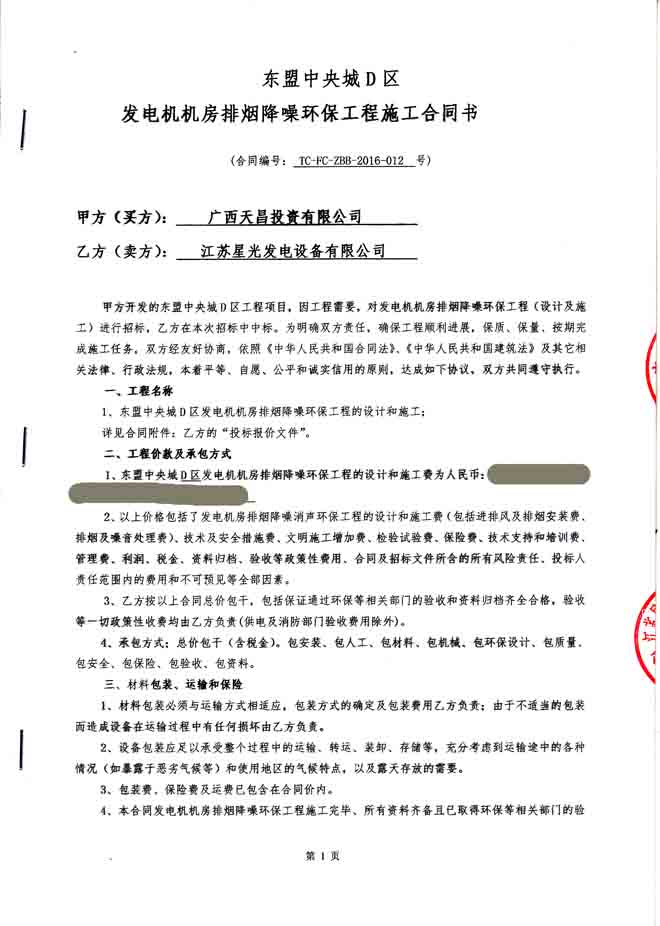 2016年5月18日,我公司就廣西天昌投資有限公司購(gòu)買(mǎi)的400KW康明斯發(fā)電機(jī)簽訂?wèn)|盟中央城D區(qū)發(fā)電機(jī)機(jī)房排煙降噪環(huán)保工程施工合同,我公司為其提供柴油發(fā)電機(jī)組的機(jī)房噪聲、廢氣綜合治理、環(huán)保工程及機(jī)房照明、排風(fēng)工程的設(shè)計(jì)及施工。合同如下: