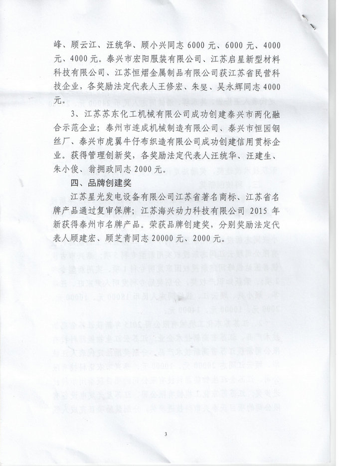 1、江蘇星光發(fā)電設(shè)備有限公司的項(xiàng)目榮獲“泰興市科技進(jìn)步獎(jiǎng)”。