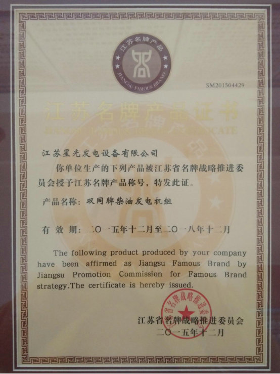 江蘇省名牌戰(zhàn)略推進(jìn)委員會(huì)組織的2015年度江蘇省名牌評(píng)選活動(dòng)中,雙同牌發(fā)電機(jī)組喜獲"江蘇名牌產(chǎn)品"榮譽(yù)稱號(hào)。