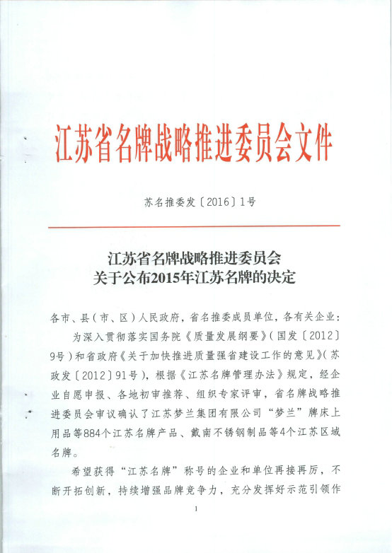 2016226日由江蘇省名牌戰(zhàn)略推進(jìn)委員發(fā)布的文件江蘇省名牌戰(zhàn)略推進(jìn)委員會(huì)關(guān)于公布2015年江蘇名牌的決定》中我公司“雙同”牌發(fā)電機(jī)組榜上有名。"江蘇名牌產(chǎn)品"稱號(hào),看似"無形"實(shí)為"有形"的知識(shí)產(chǎn)權(quán),具有巨大的含金量。