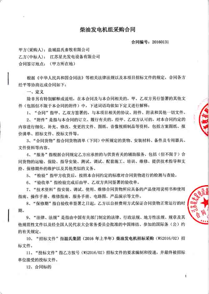 江蘇星光動力集團 >> 新聞動態(tài) >> 鹽城溫氏畜牧有限公司500KW康明斯發(fā)電機組采購合同