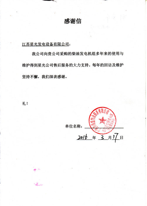2016年3月17日,我星光公司售后服務(wù)人員收到廣西華保盛物業(yè)服務(wù)有限公司五環(huán)星光住宅小區(qū)物業(yè)服務(wù)中心的感謝信,對我公司服務(wù)反應(yīng)迅速,上門維修保養(yǎng)柴油發(fā)電機(jī)組服務(wù)到位,認(rèn)真的售后服務(wù)工作表示感謝!