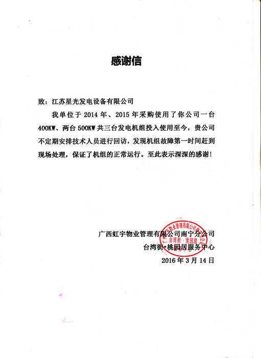2016年3月14日,我公司收到廣西虹宇物業(yè)管理有限公司南寧分公司的感謝信,其對(duì)我公司提供的一臺(tái)400KW發(fā)電機(jī)、兩臺(tái)500KW發(fā)電機(jī)組三臺(tái)柴油發(fā)電機(jī)組的使用及完善的發(fā)電機(jī)售后服務(wù)表示滿意,我公司深感榮幸,今后一定更加不懈努力,以更加優(yōu)質(zhì)的產(chǎn)品以及更好的售后服務(wù),贏得更多用戶的肯定。以下是感謝信掃描件: