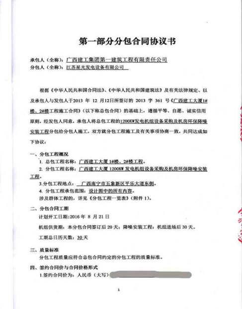2016年8月20日,廣西建工集團(tuán)第一建筑工程有限責(zé)任公司與星光發(fā)電機(jī)簽訂廣西建工大廈1#樓、2#樓工程1200KW發(fā)電機(jī)采購及機(jī)房環(huán)保降噪安裝工程分包合同。