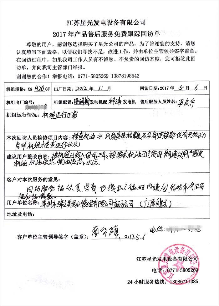 江蘇星光動力集團 >> 服務(wù)跟蹤 >> 我公司為深圳市締之美物業(yè)管理公司920KW康明斯發(fā)電機組免費售后跟蹤回訪