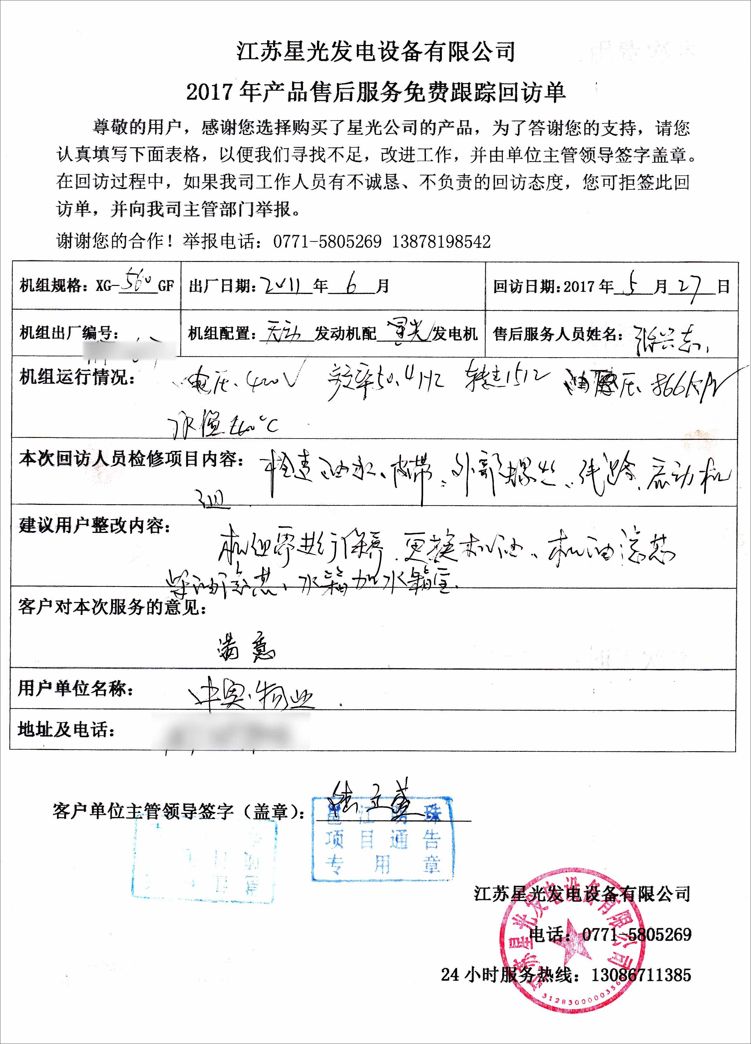 5月27日,我公司售后技術(shù)員張師傅到中奧物業(yè)進(jìn)行免費(fèi)售后跟蹤回訪。其于2011年6月在我司購買配置為無動(dòng)發(fā)動(dòng)機(jī)配星光發(fā)電機(jī)的560KW無動(dòng)發(fā)電機(jī)組一臺(tái)。張師傅現(xiàn)場(chǎng)檢查了機(jī)油、水、皮帶、外部螺絲、線路并啟動(dòng)機(jī)組,建議用戶更換機(jī)油、機(jī)油濾芯、柴油濾芯、水箱加水箱寶等,對(duì)機(jī)組進(jìn)行保養(yǎng)以延長機(jī)組的使用壽命。