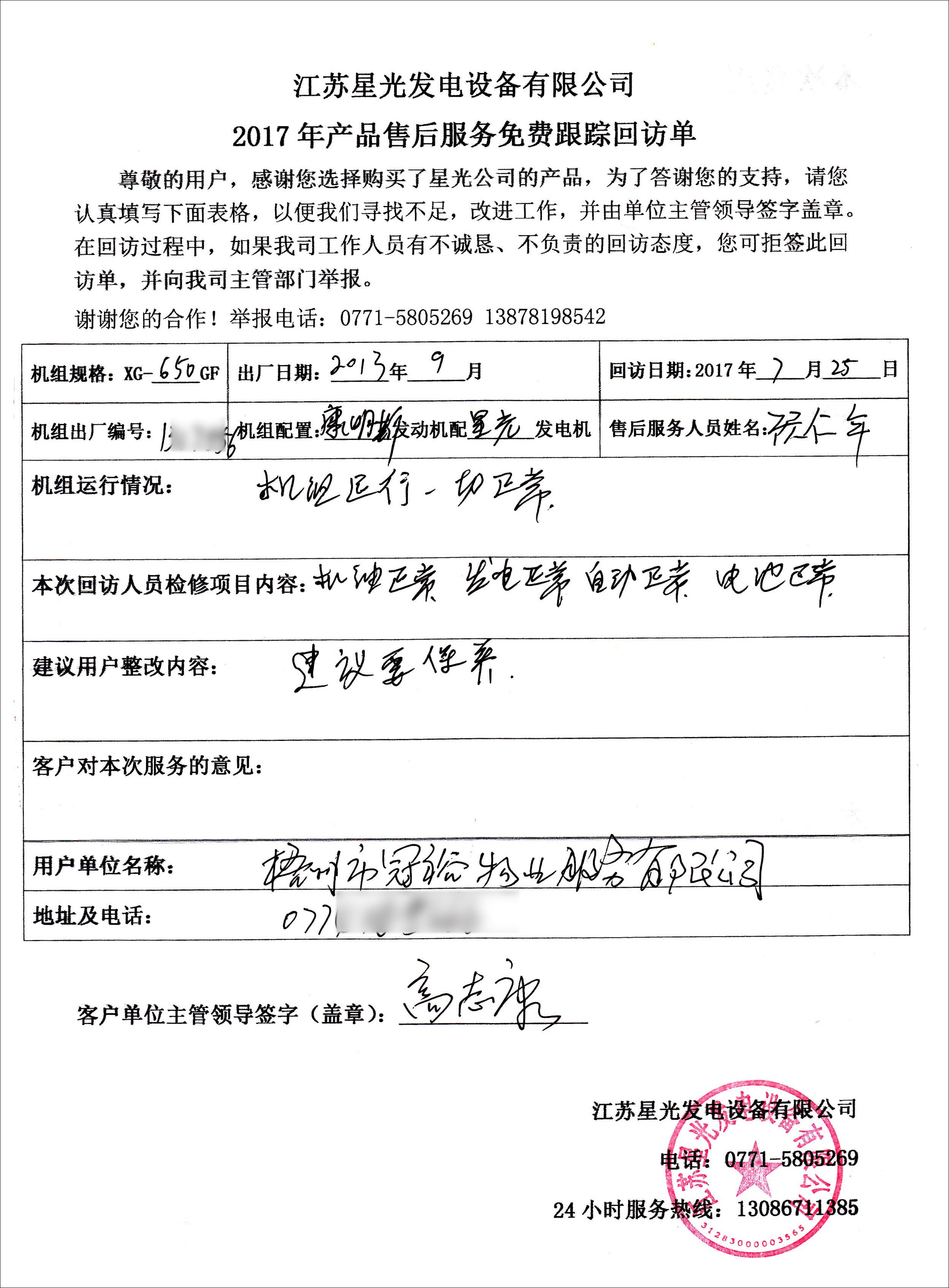 我公司為梧州冠裕物業(yè)公司兩臺(tái)康明斯發(fā)電機(jī)組免費(fèi)售后