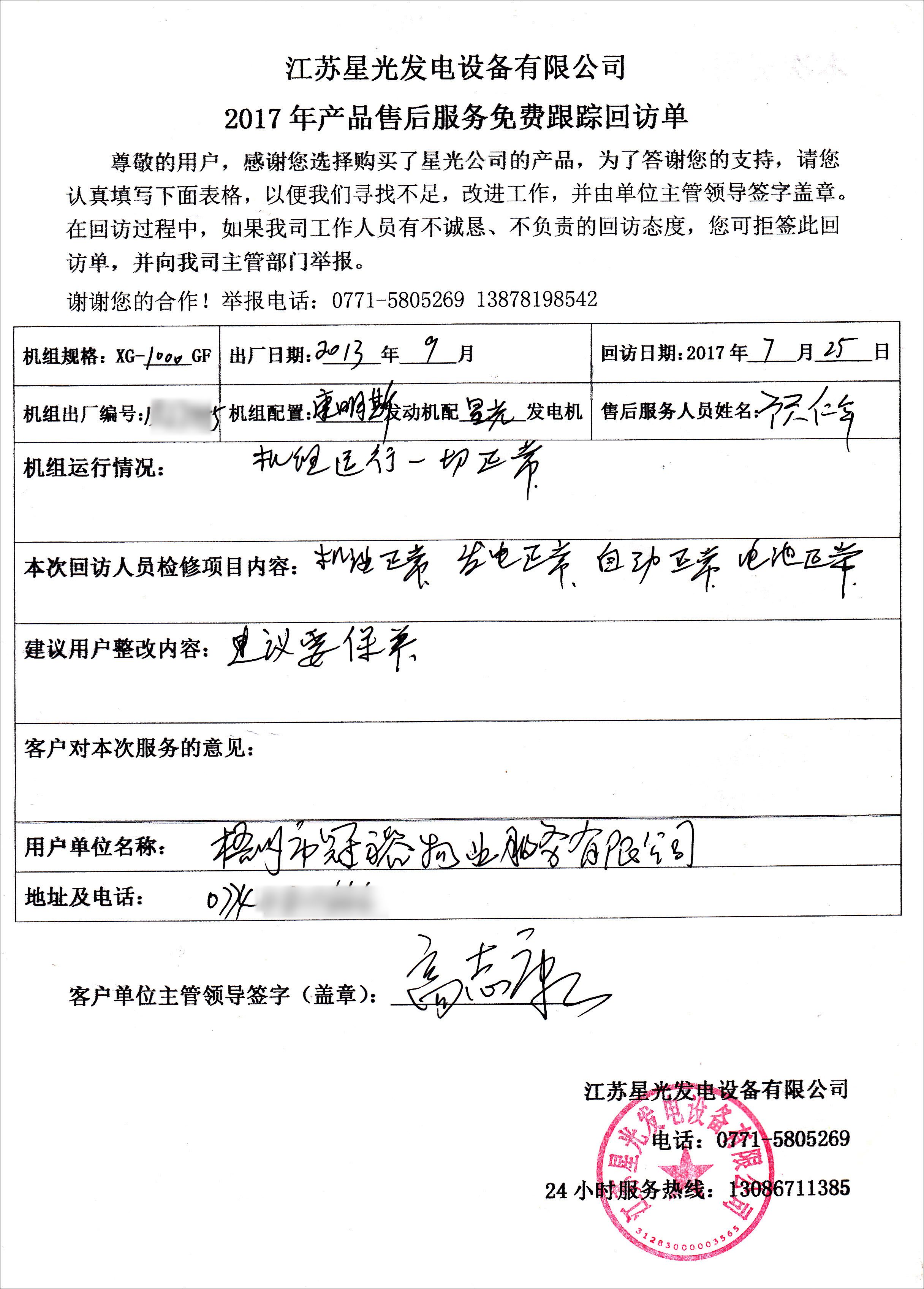 江蘇星光動(dòng)力集團(tuán) >> 服務(wù)跟蹤 >> 我公司為梧州冠裕物業(yè)公司兩臺(tái)康明斯發(fā)電機(jī)組免費(fèi)售后