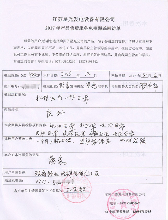 江蘇星光動力集團(tuán) >> 服務(wù)跟蹤 >> 我公司售后技術(shù)員顧師傅為南寧鳳祥名居小區(qū)里卡多發(fā)電機(jī)組免費(fèi)上門回訪