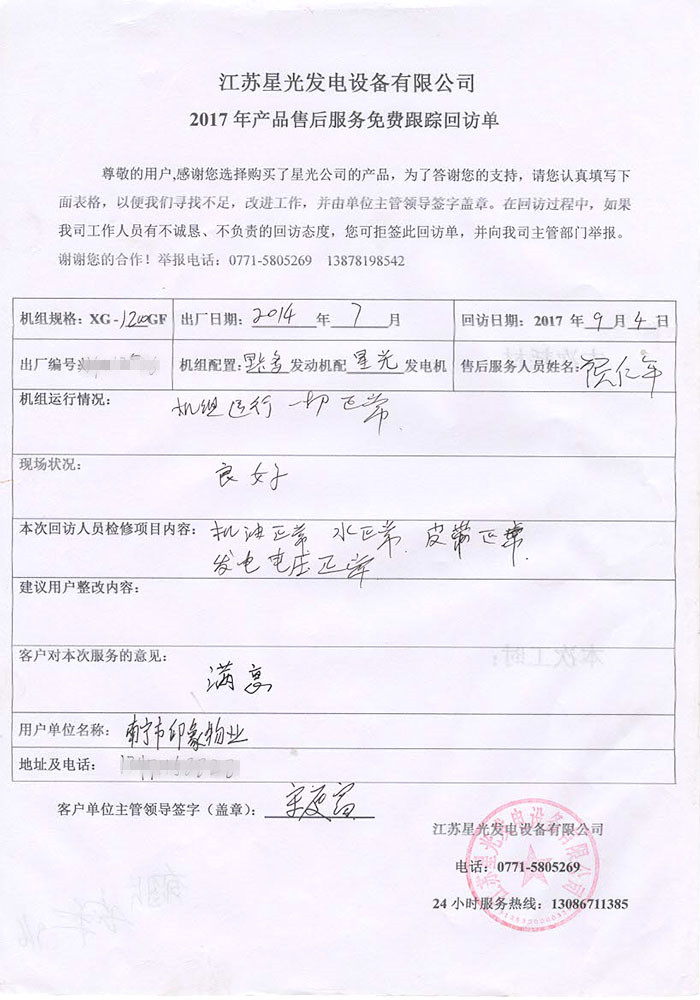江蘇星光動(dòng)力集團(tuán) >> 服務(wù)跟蹤 >> 南寧市印象物業(yè)1200KW里卡多發(fā)電機(jī)組免費(fèi)跟蹤回訪
