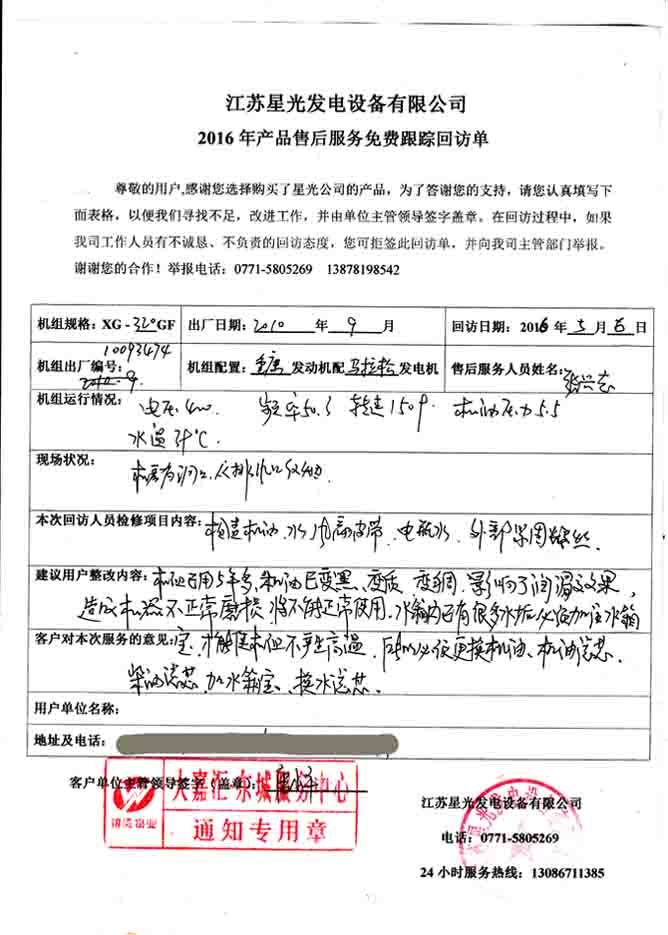 江蘇星光動力集團 >> 服務跟蹤 >> 大嘉匯東城服務中心320KW康明斯發(fā)電機組免費回訪記錄