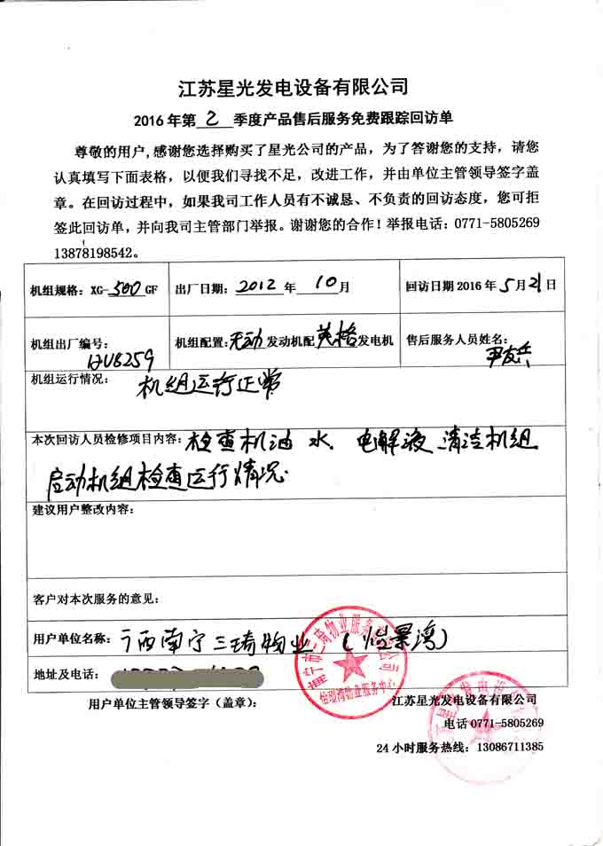 2016年5月21日,我公司技術(shù)人員到怡景灣,對我公司為南寧市三琦物業(yè)服務(wù)有限公司提供的500KW柴油發(fā)電機組(配置為無動發(fā)動機配英格發(fā)電機)進行免費回訪。技術(shù)人員本次回訪主要的啟動機組檢測機組的運行情況,檢查機組的機油、水箱水、電解液,并對機組進行清潔。下面是本次回訪記錄: