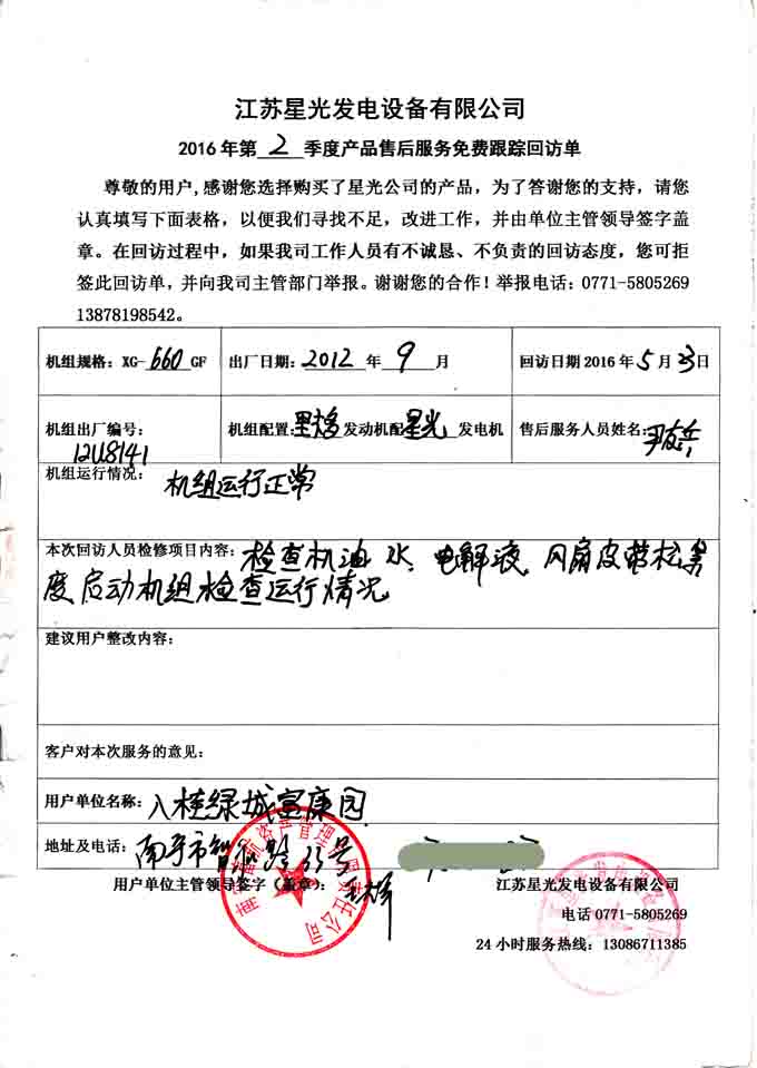江蘇星光動力集團(tuán) >> 服務(wù)跟蹤 >> 八桂綠城富康園660KW里卡多發(fā)電機(jī)組免費回訪記錄