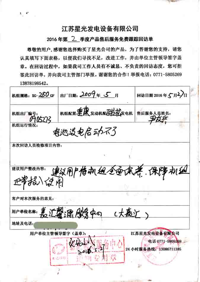 江蘇星光動(dòng)力集團(tuán) >> 服務(wù)跟蹤 >> 嘉匯馨源服務(wù)中心250KW康明斯發(fā)電機(jī)組免費(fèi)回訪記錄