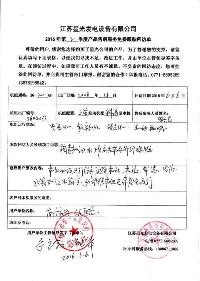 2016年6月6日,我星光公司售后技術(shù)人員到南寧市第一人民醫(yī)院,對我公司為其提供的400KW上柴柴油發(fā)電機(jī)組進(jìn)行回訪。技術(shù)人員到達(dá)發(fā)電機(jī)房后對機(jī)組的機(jī)油、水箱水、風(fēng)扇皮帶、外部螺絲緊固等部件情況進(jìn)行檢查,并啟動(dòng)機(jī)組檢測機(jī)組各參數(shù)正常等。下面是本次回訪記錄: