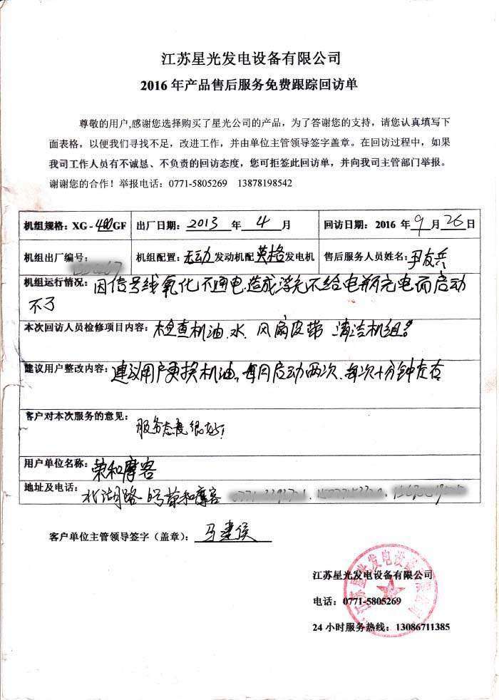 江蘇星光動(dòng)力集團(tuán) >> 服務(wù)跟蹤 >> 榮和摩客400KW無(wú)動(dòng)柴油發(fā)電機(jī)組免費(fèi)售后跟蹤回訪