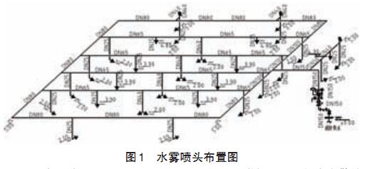 ?。?)根據(jù)柴油發(fā)電站布置,布置水霧噴頭30個(gè),另油箱間設(shè)置3個(gè)噴頭進(jìn)行保護(hù)。共33個(gè),計(jì)算秒流量34.65L/s,設(shè)計(jì)秒流量3.8.1L/s,消防水進(jìn)水管管徑DN150,設(shè)計(jì)流速1.98m/s<5m/s.水霧噴頭布置見圖1.