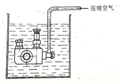 擰緊手泵,堵住出油口,把輸油泵浸在清潔的柴油中(如下圖),以0.3Mpa(3kgf/㎡)的壓縮空氣通入進(jìn)油口,觀察進(jìn)出油接頭處、活塞彈簧緊座,手泵等結(jié)合面的密封情況,不許有冒氣泡的現(xiàn)象。頂桿偶件處只允許有少量、細(xì)小的氣泡溢出。