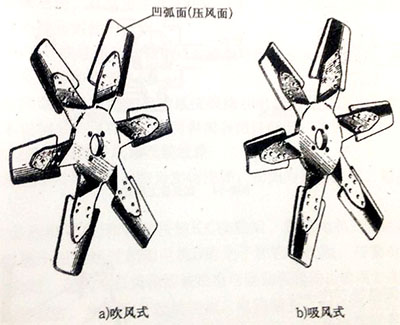 柴油發(fā)電機(jī)組工作時(shí),按其旋轉(zhuǎn)方向,根據(jù)風(fēng)葉的凹弧面應(yīng)為壓風(fēng)面的原則采判斷風(fēng)扇是吹風(fēng)式還是吸風(fēng)式,例如面向柴油發(fā)電機(jī)組前端看,如果風(fēng)扇的壓風(fēng)面(凹弧面)面向您時(shí),即為吹風(fēng)式;反之非壓風(fēng)面(凸弧面)面向您時(shí)則為吸風(fēng)式(如圖2所示)。安裝風(fēng)扇時(shí)切勿裝反,否則風(fēng)葉的非壓風(fēng)面將成為壓風(fēng)面,影響風(fēng)扇風(fēng)量,使散熱器的散熱效果下降。