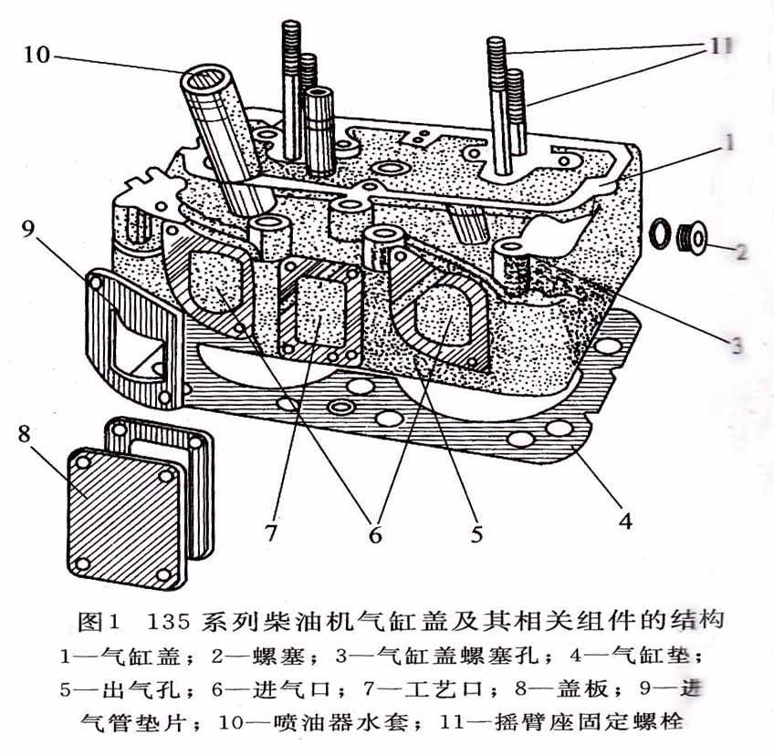 2、雙缸式,每兩個氣缸共用一個氣缸蓋(如圖1所示135系列柴油機氣缸蓋及其相關(guān)組件的結(jié)構(gòu));