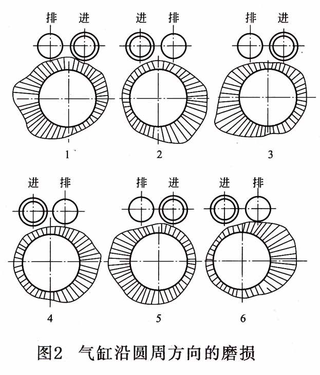 1、沿長(zhǎng)度方向成“錐形”,圖1是氣缸沿長(zhǎng)度方向磨損示意圖,圖中的陰影部分表示磨損量,由圖可知:在活塞環(huán)運(yùn)動(dòng)區(qū)域內(nèi)磨損較大;這種磨損是不均勻的,上重下輕,使氣缸沿長(zhǎng)度方向成“錐形”;其最大磨損發(fā)生在活塞處于上止點(diǎn)時(shí),與第一道活塞環(huán)相對(duì)的氣缸壁稍下處;最小的磨損發(fā)生在氣缸的最下部,即活塞行程以外的氣缸壁。